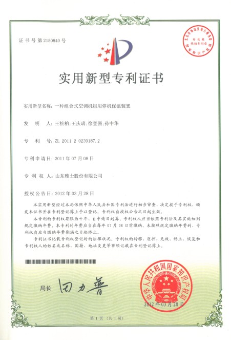 組合式空調機組(立式)專利證書